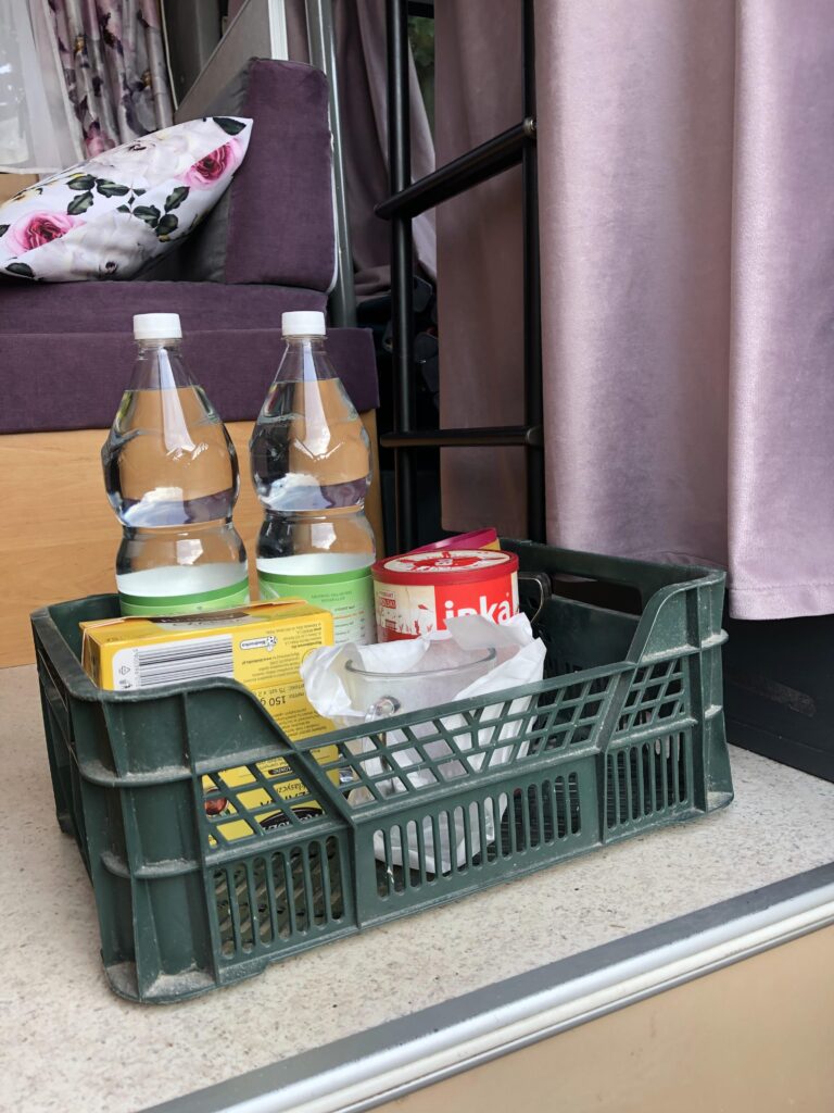 Kiedy wynajmujecie kampera warto zapytać właściciela o to, w co wyposażony jest pojazd. W naszym przypadku znajdziecie podstawowe wyposażenie kuchni (talerzyki, kubeczki, sztućce, czajnik, patelnia, garnek), stolik i krzesła turystyczne, bagażnik na rowery, butlę z gazem, chemię do toalety i papier, konewkę, wąż do wody, przetwornicę na 230V, kabel do podpięcia na campingu oraz wszelkie narzędzia, takie jak śrubokręty czy klucze. Na życzenie możemy naszykować grill, siekierkę czy łopatę. Szczegóły odnośnie wyposażenia i specyfikacji kamperów znajdziecie tutaj. Oprócz rzeczy osobistych i kosmetyków, musicie zabrać ze sobą na pewno ręczniki i pościel – to leży po stronie najemcy.