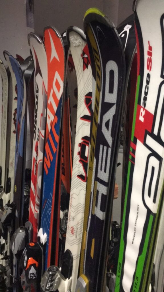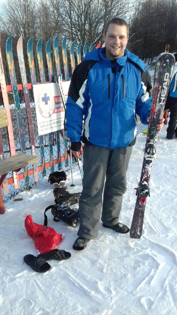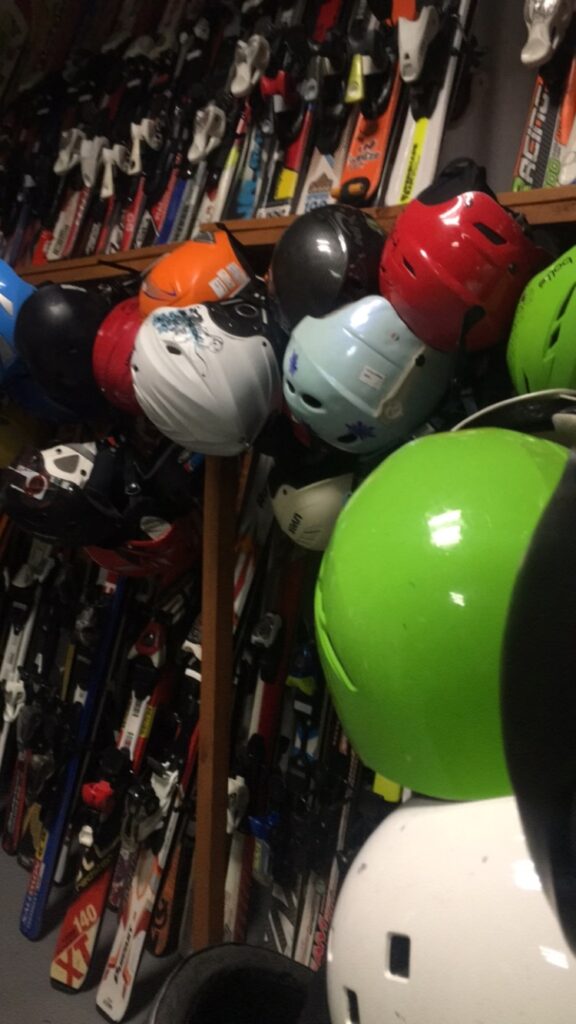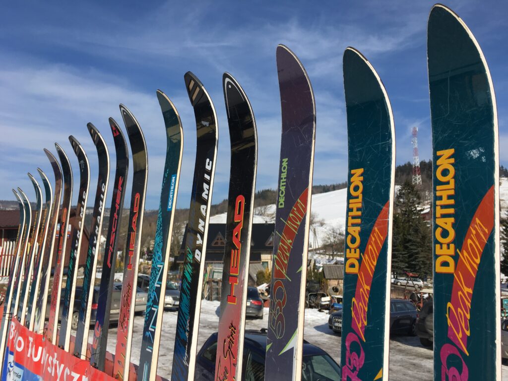 Na wyjazd przygotowaliśmy się wypożyczając narty już w Łodzi w sklepie Happy Ski przy ul. Żeromskiego 73. Za cały zestaw (narty, buty, kijki – które okazały się być niepotrzebne, kaski i gogle) zapłaciliśmy 30 zł za osobę za dobę. Co ważne, jeżeli zechcielibyśmy kupić wypożyczony sprzęt cena wynajmu byłaby wliczona w cenę zakupu. Takim sposobem wyeliminowaliśmy problem braku sprzętu w wypożyczalni i wysokich cen za granicą.
