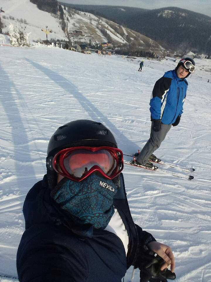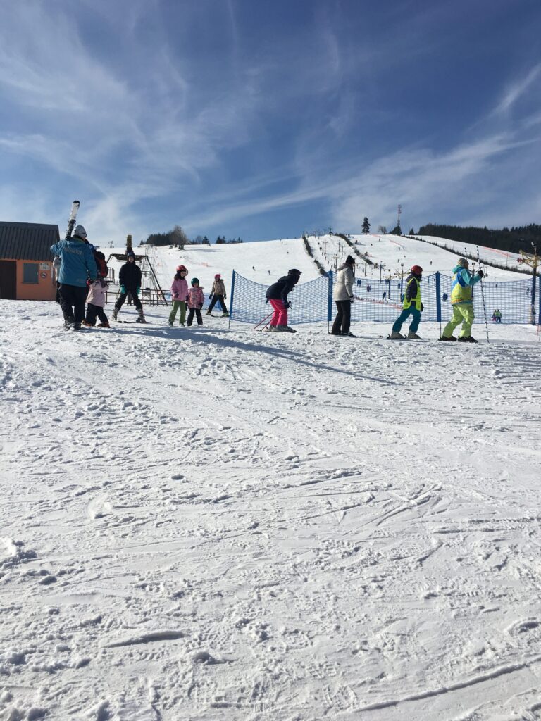 Jako pierwszy cel podróży obraliśmy Rzeczkę (gmina Walim), którą to lokacje polecił nam Pan w sklepie z nartami. To właśnie tam stawialiśmy nasze pierwsze kroki na nartach. Zaczęliśmy oczywiście od jazdy z instruktorem. Niecała godzina wystarczyła, żeby pokazać trzem osobom podstawy jazdy na nartach – wstawanie, obracanie, hamowanie, skręcanie. Ja swoją naukę zakończyłam na hamowaniu… Po lekcji z instruktorem byłam więcej niż pewna, że nie ma najmniejszej szansy, żebym bez asekuracji wczepiła chociaż drugą nartę. Tak panicznie się bałam, nie miałam żadnej kontroli nad nartami. Na szczęście nie byłam sama więc Mój Mąż dzielnie mnie asekurował i małymi kroczkami uczyłam się jeździć samodzielnie. Chłopakom narty bardzo się podobały, już drugiego dnia poszli na wyciąg.
