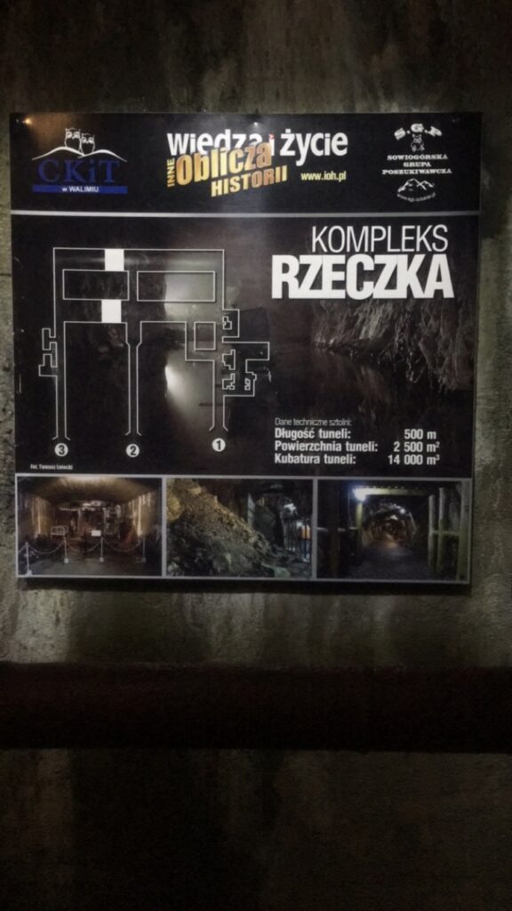 Warunki w Rzeczce tak nam się spodobały, że postanowiliśmy tam wrócić. Szczególnie, że mieliśmy jeszcze do zwiedzenia jeden obiekt. Sztolnie Walimskie – kompleks Rzeczka to część zespołów schronów “RIESE”. Cel budowy do dziś nie jest znany. Istnieją trzy hipotezy: laboratorium, kwatera główna lub fabryka. Na poparcie każdej z hipotez znajdą się argumenty lecz nie ma żadnych historycznych dokumentów na potwierdzenie którejś z nich. Zwiedzanie kompleksu zajęło nam około godzinę, która minęła w oka mgnieniu. Przewodnik okazał się być badaczem tego miejsca i widać było, że pasjonuje się tym, co opowiada. Dodatkowo zwiedzanie wzbogacone było wizualizacjami – grą światła i dźwięku, które pobudziły naszą wyobraźnie.